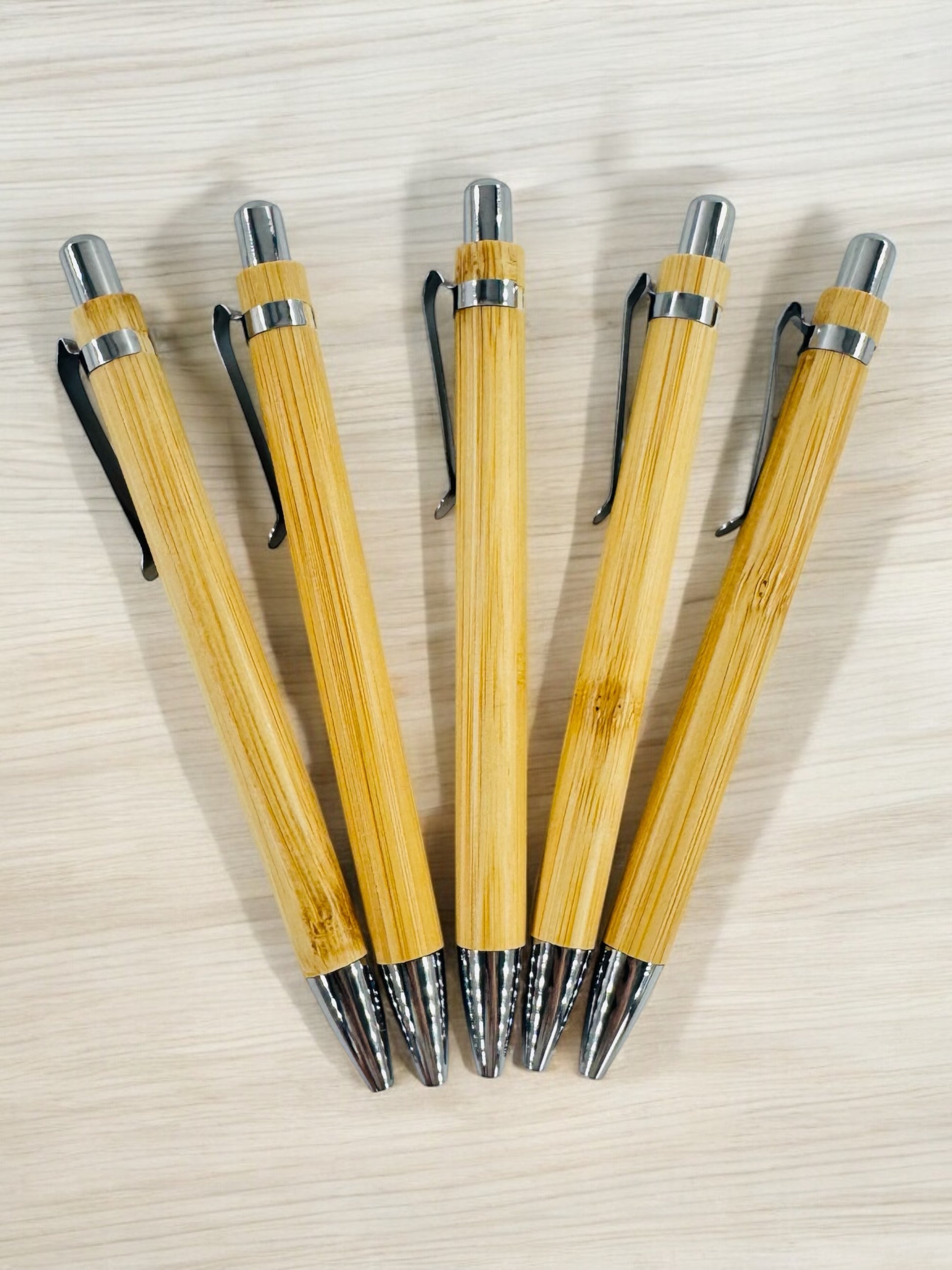 Eco-Friendly Bamboo Ballpoint Pens, designed for those who value sustainability and style. Crafted from natural bamboo and paired with smooth black ink, these pens are perfect for everyday use or as thoughtful, personalized gifts. Add your custom laser-engraved design—names, logos, or messages—to make each pen uniquely yours.